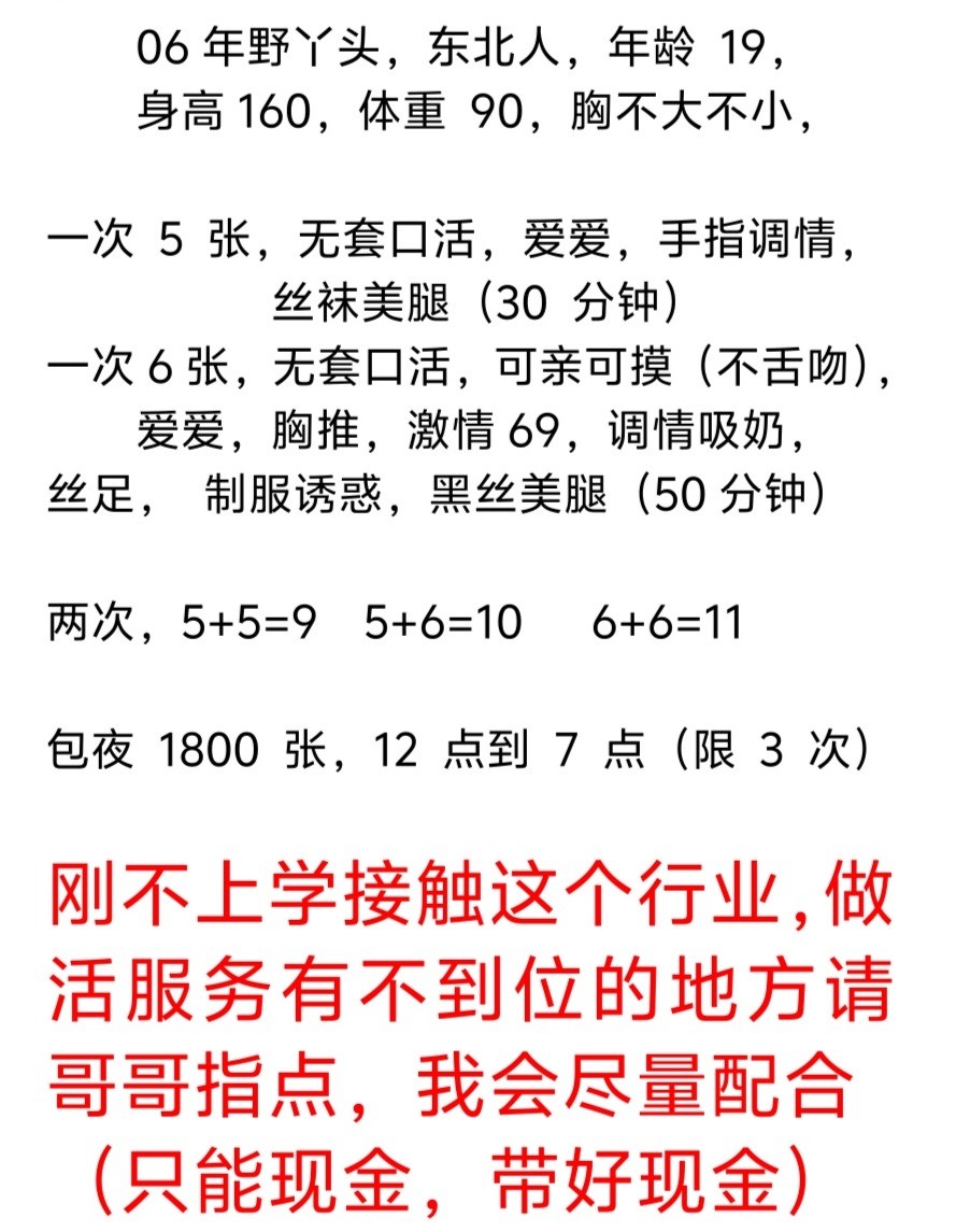 一看就是刚入行的小姑娘,跟素人一样,不会聊天,不会催促走流程。就在那不知道说啥好,但还不是冷,你问啥她就是说啥,只是不知道怎么跟你沟通。为了增进感情,一起抽了支烟,聊几句,打破下尴尬局面。确定了6张价位,然后自己去冲洗。回来以后小东西已经把自己....未登录用户只显示部分内容,完整内容请登录后查看